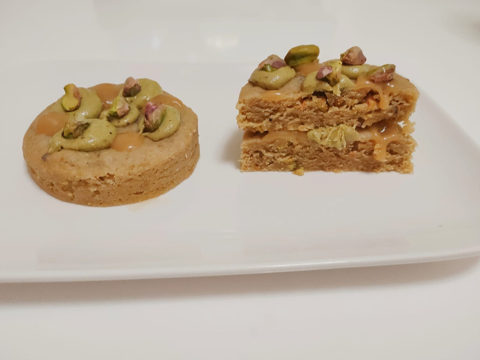Pâte à cookie aux brisures de pistaches, crème de Pistache maison, caramel vanille et Pistaches entières